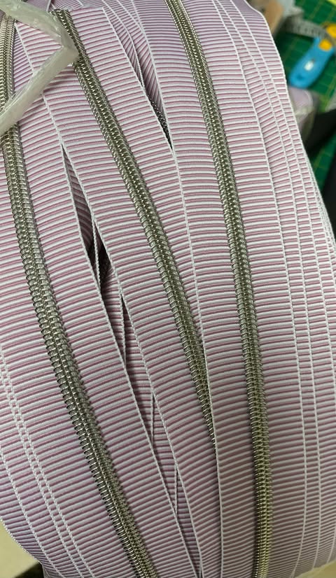 Lynlås i metermål – Stribet Lys lilla/hvid – med sølv/Champange